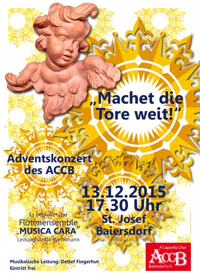 Im Dezember desselben Jahres hat der Chor mit seinem neuen Chorleiter dann eine erste Visitenkarte abgegeben. Das Adventskonzert mit einigen Klassikern der adventlichen Chorliteratur Tochter Zion, Maria durch ein’ Dornwald ging, Es ist ein Ros‘ entsprungen u.a. sowie dem Titellied Machet die Tore weit wurde durch einige Lieder aus dem europäischen Ausland ergänzt, einige Titel Je sais vierge Marie, Dormi dormi bel Bambini, Go tell it on the mountain und Angels‘ Carol. Im Rahmen dieses Konzertes stellte sich auch das Flötenensemble MUSICA CARA mit einigen klassischen Stücken vor.