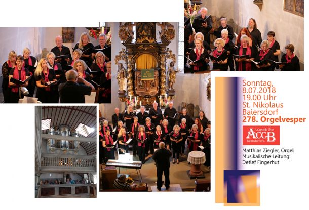 In 2018 hatten wir dann nach vielen Jahren wieder die Möglichkeit in der evangelischen Stadtpfarrkirche St. Nikolaus eine Orgelvesper zu singen. Unser Chorleiter stellte hierfür mit Chorsätzen aus der Zeit des Barock bis in die heutige Zeit von Melchior Franck bis Wolfram Menschick und John Rutter ein abwechslungsreiches Programm zusammen. Zum Abschluss der Orgelvesper wurde das Halleluja von Leonhard Cohen in einer Bearbeitung von Roger Emerson gesungen.